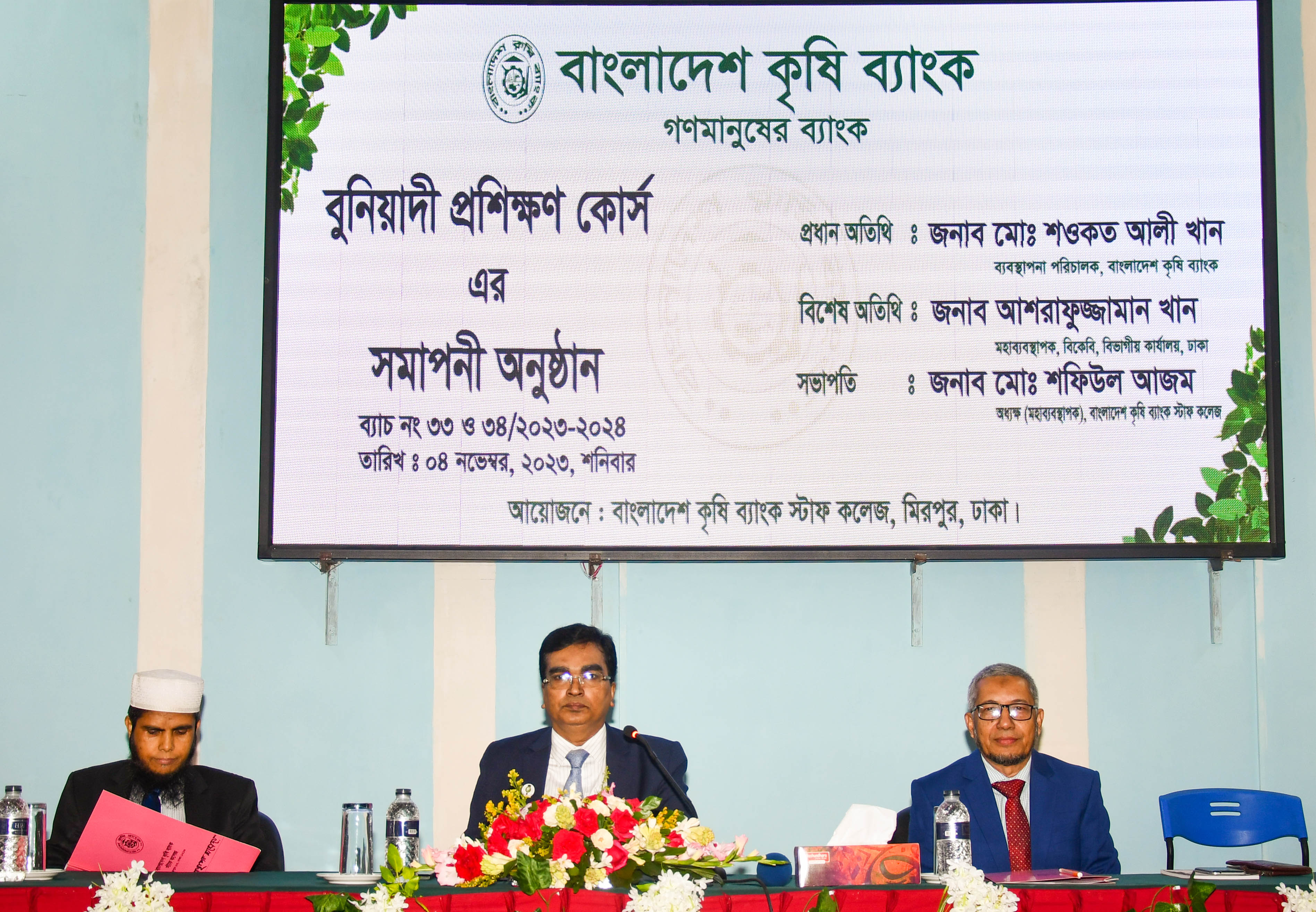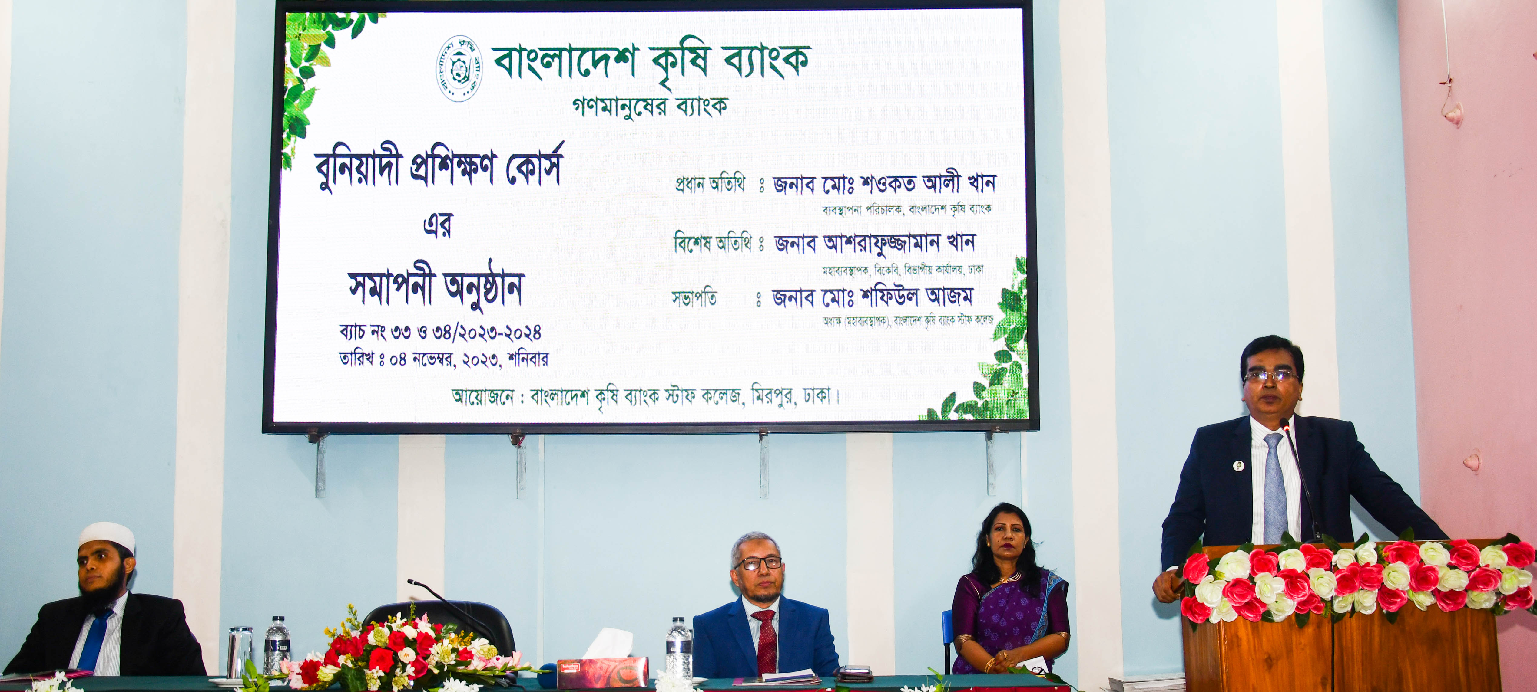 Valediction ceremony of Foundation Training Course for Senior Officers', Officers' and Officers' (Cash) batch No. 33 & 34/2023-24 of BKB was held on 04.11.2023. The Honorable Managing Director of Bangladesh Krishi Bank Mr. Md. Shawkat Ali Khan was present on the ceremony.